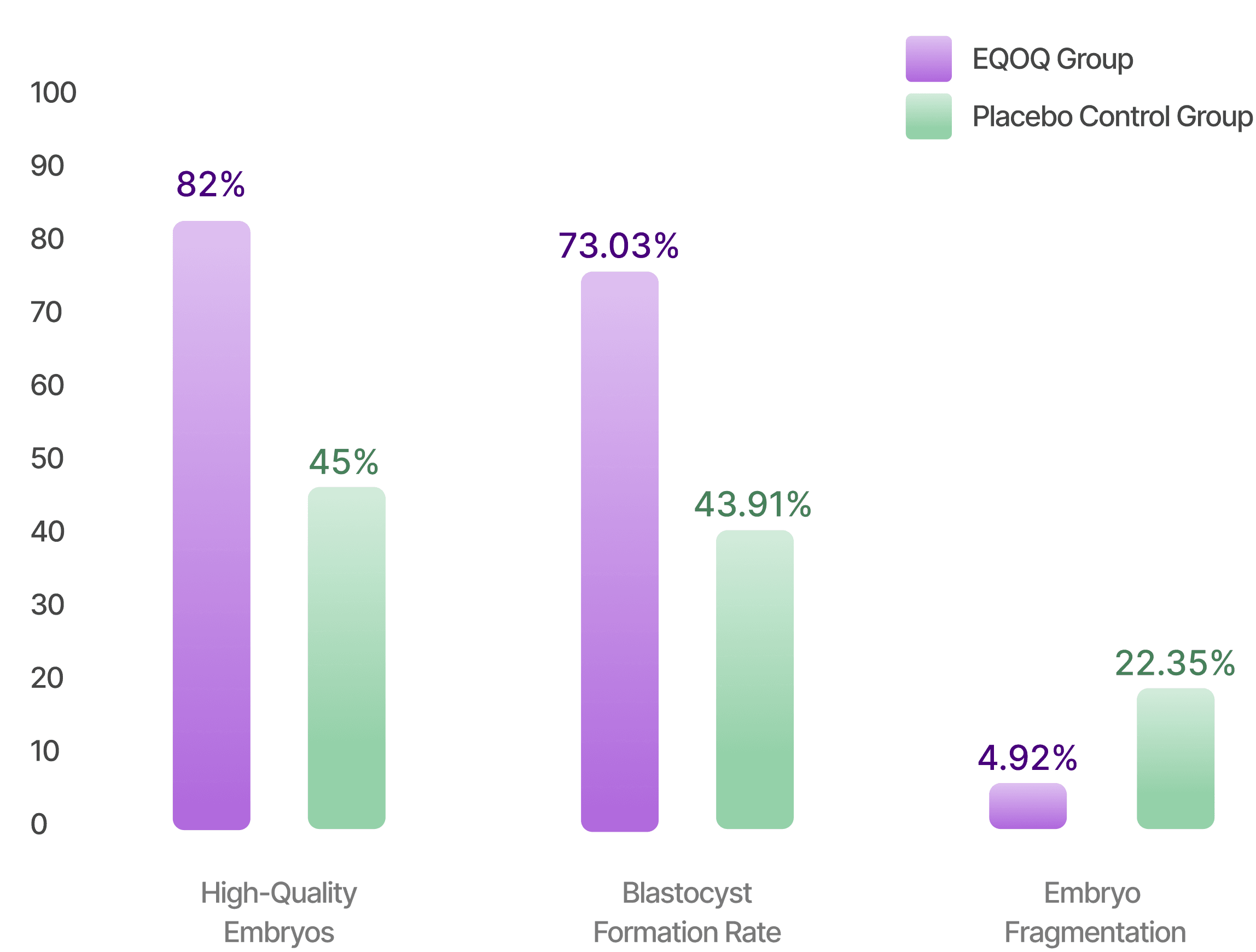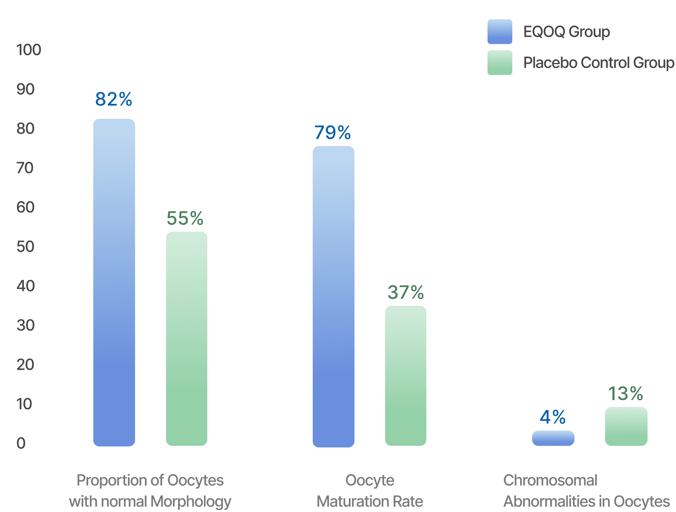 EQOQ boosts NAD⁺ in the ovaries, enhancing mitochondrial function and energy. It reduces spindle abnormalities and improves oocyte quality, supporting fertility.